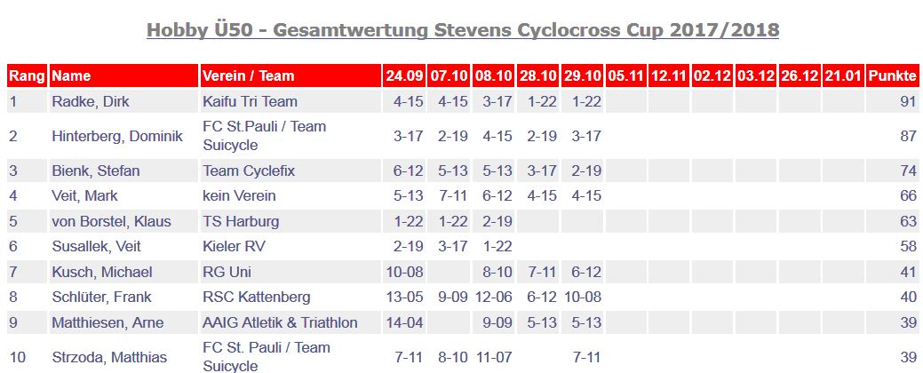 Am Wochende standen die Läufe 4+5 des Stevens Cyclocross Cup 2017/2018 in Mölln auf dem Programm. Dirk konnte in beiden Läufen den Sieg einfahren, damit übernahm er auch das rote Führungstrikot. (mr)