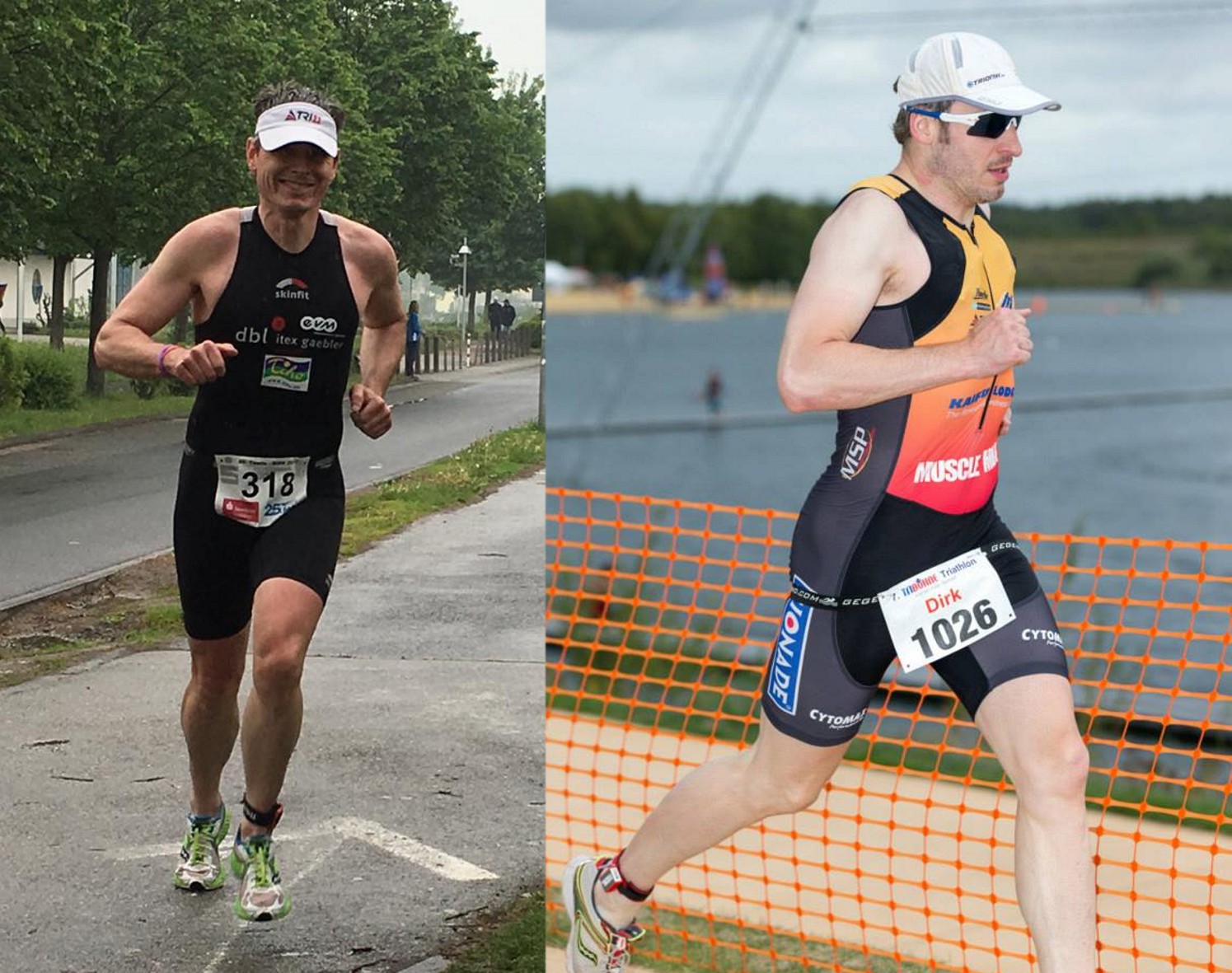 Nach 500 m Schwimmen und 20 km Radfahren konnte sich keiner von uns absetzen, gemeinsam ging es durch die WZ2 zum Laufen. Durch ständige Tempowechsel versuchte Dirk meinen Rhytmus zu brechen, was ihm zur Hälfte der Strecke dann auch gelang. Dadurch enstand schnell eine kleine Lücke, die er bis ins Ziel verteidigen konnte. Wir zwei alten Säcke hatten die Ehre im Elite Feld mitzustarten. In diesem Feld haben wir alles andere als Alt ausgesehen und konnten das hohe Grundtempo der Startgruppen mitgehen.